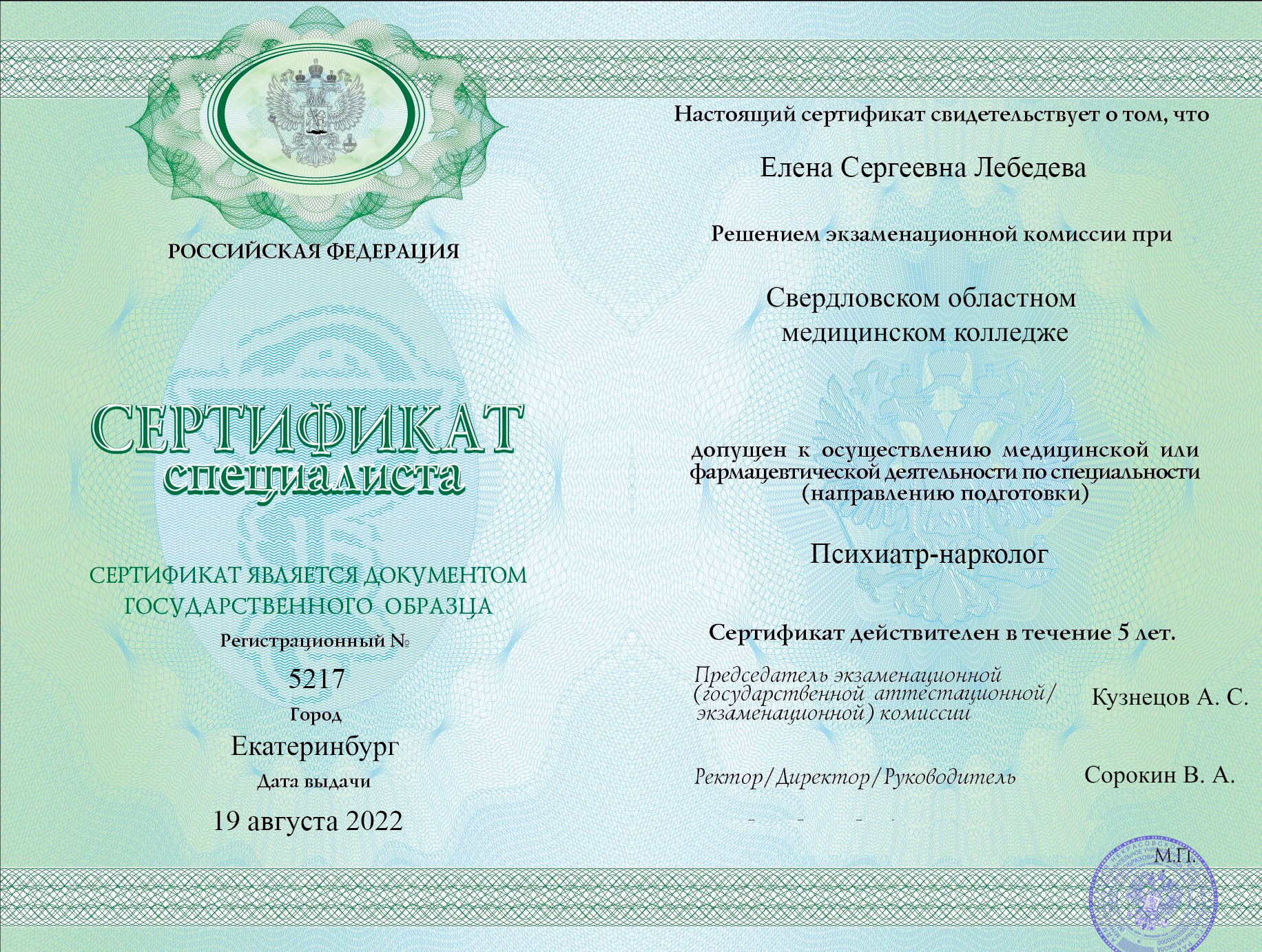 • 1995-1997 г. Специализация - клиническая ординатура на кафедре «Нервных болезней и Нейрохирургии» РостГму, сертификат специалиста по специальности – «Неврология» (с 1997г.)